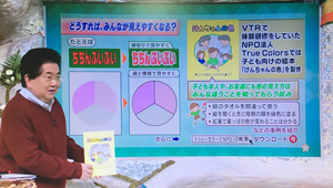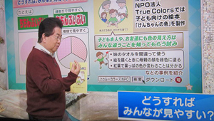 どうすればみんなが見やすい? たとえば、文字は縁取りで見やすくする。グラフなどは線と模様で区切りをつける。VTRで、体験研修をしていたNPO法人「True Colors」では、子ども向けの絵本「けんちゃんの色」を製作。子ども本人や、お友達にも色の見え方はみんな違うことを知ってもらう試み。「姉のタオルを間違って使う」「絵を描くときに母親の顔を緑色に塗る」「紅葉で葉っぱの色が変わることは分かる」などの事例を紹介。石田英司さんらは「人それぞれかもしれませんけど、気づかなかったことが分かったような気がします」などと言った。絵本はNPOのHPからダウンロード可能。