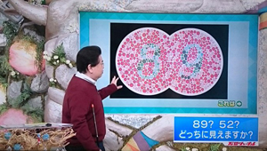 色覚検査の映像を紹介。スタジオメンバーにどう見えるか数字を読んでもらうと89と答えたが、石田英司が不思議だがモニター見てくださいと言うと全員52に見えると驚く。これはテレビのモニターの特性で本来は89と見えたら異常なしだが、52に見えるとちょっと異常ありとなる。しかし、テレビのモニターは人間の目よりは色の識別ができないそうだと石田は説明。