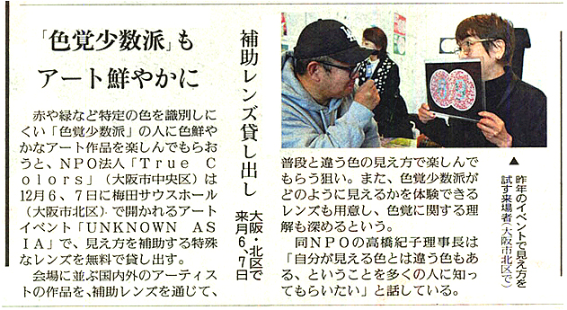 赤や緑など特定の色を識別しにくい「色覚少数派」の人に色鮮やかなアート作品を楽しんでもらおうと、NPO法人「True Colors」(大阪市中央区)は、12月6、7日に梅田サウスホール(大阪市北区)で開かれるアートイベント「UNKNOWN ASIA」で、見え方を補助する特殊なレンズを無料で貸し出す。