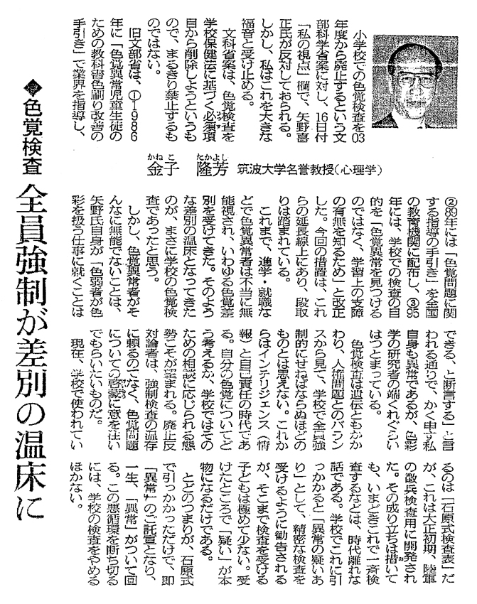 小学校での色覚検査を03年度から廃止するという文部科学省案に対し、16日付 「私の視点」欄で、矢野喜正氏が反対しておられる。しかし、私はこれを大きな福音と受け止める。