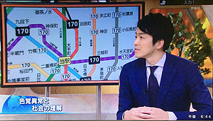 取材した薄井大郎記者も色覚異常の当事者であるという。「学校で色覚検査を受けて明らかになった。赤と緑や緑と茶色といった色の区別が苦手。幼いころからどんな色が苦手がわかっているので対処することができる。かつては進学や就職で今よりも大きな壁があった。理系学部へ進学にも制限があった。多くは偏見に基づくものだったのでこの差別は忘れていけない。医学的には色覚異常という言葉が使われているが、最近は色覚多様性という言葉もできている。東京の地下鉄の路線図ではバリアフリーが進んでいる。社会からの理解が深まってほしい」と述べた。