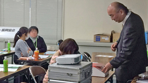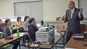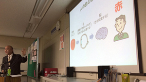 当日は、「色覚問題の実際と補正レンズ」について、免許取得試験や免許更新時、全国で指導官として立ち会われている職員の方々に、実際に補正レンズやレンズ選定器を体験していただきながら、ネオ・ダルトン(株)の足立社長が講演しました。