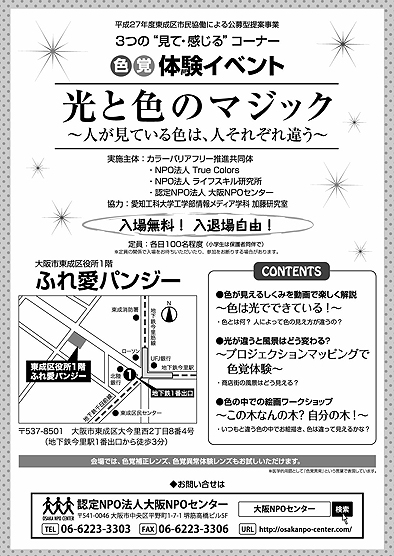 平成27年度東成区市民恊働による公募型提案事業 3つの“見て・感じる”コーナー 色覚体験イベント 光と色のマジック 〜人が見ている色は、人それぞれ違う〜