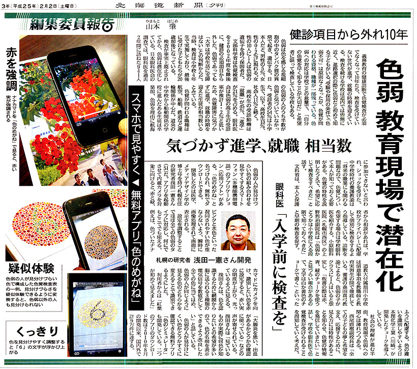 文科省は、本人と保護者から相談があれば、学校がプライバシーに配慮して個別に検査をするよう指導している。診断を希望する場合は学校眼科医を紹介する。小原眼科医院(札幌市西区)の上野哲治副院長は「色弱かどうかは小学校に入る段階で知っておくべきだ」と早期の検査を促す。