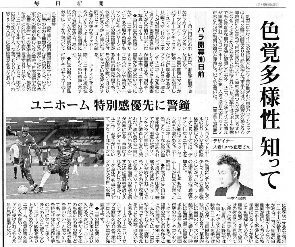 新型コロナウイルスの感染拡大により1年延期された東京パラリンピックは5日、2度目の開幕200日前を迎えた。東京大会はパラ競技の対象となる障害者にとどまらず、日常生活にバリアー(障壁)を持つ人々が生活しやすい社会をつくるきっかけになることが期待されている。近年ではスポーツ観戦でもさまざまな色の見え方に配慮した「カラーユニバーサルデザイン」の考えが重要視されている。ユニホームデザインの第一人者である大岩Larry正志さん(45)に国内の現状と課題について話を聞いた。【聞き手・岩壁峻】