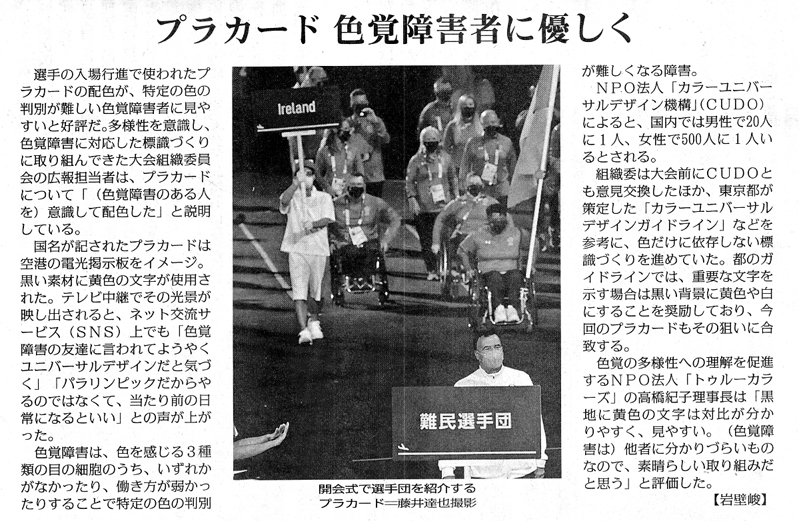 選手の入場行進で使われたプラカードの配色が、特定の色の判別が難しい色覚障害者に見やすいと好評だ。多様性を意識し、色覚障害に対応した標識づくりに取り組んできた大会組織委員会の広報担当者は、プラカードについて「(色覚障害のある人を)意識して配色した」と説明している。
