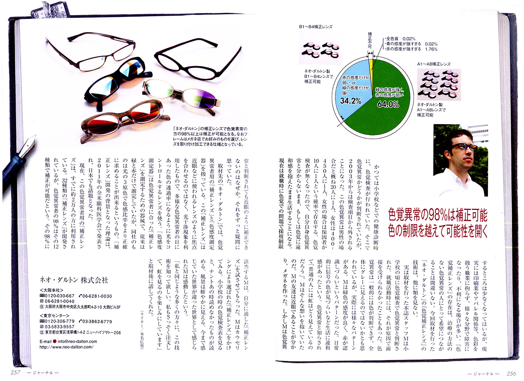 かつては小学校などでの健康診断時に、色覚検査が行われていた。そこで色覚異常かどうかが判断されていたが、2003年からは検査項目から外されることになった。この色覚異常は男性の場合だと概ね20人に1人、女性は400〜450人に1人、女性の場合は保因者が10人に1人という確立で存在する。色覚検査が無くなったので、自分自身色覚異常と分からないまま、もしくは色覚に違和感を抱えたまま生活することになる。現在は就職時に色覚での問題で採用制限するところは少なくなってはいるが、現実には印刷業やアパレル関係等、色彩を扱う職業に拘らず、様々な分野で障害になったり、不利になる場合が多い。『色覚補正レンズ』の存在は、治療の方法のない色覚異常の人にとって希望につながることは間違いない。今回取材を行った「ネオ・ダルトン」の『色覚補正レンズ』の技術は、他に類を見ない。