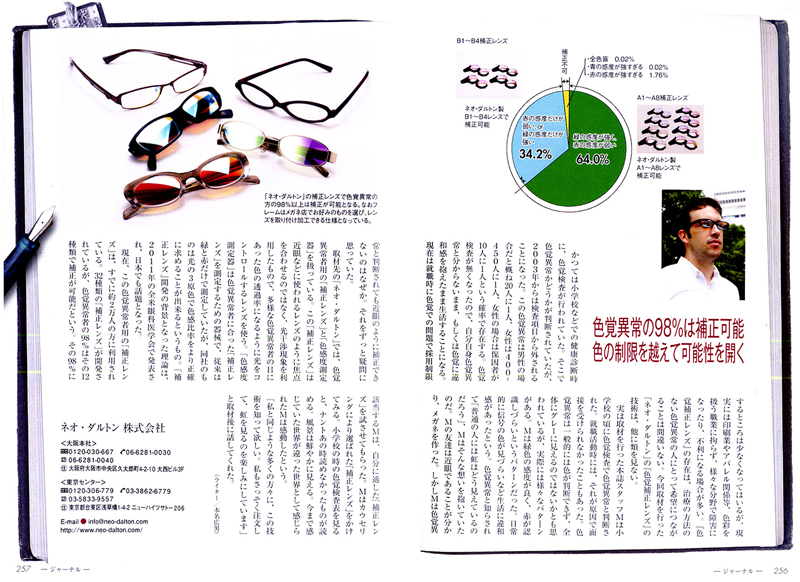 取材先の「ネオ・ダルトン」では、色覚異常者用の「補正レンズ」と「色感度測定器」を扱っている。この「補正レンズ」は近眼などに使われるレンズのように焦点を合わせるのではなく、光干渉現象を利用したもので、多様な色覚異常者の目に合った色の透過率になるように光をコントロールするレンズを使う。「色感度測定器」は色覚異常者に合った「補正レンズ」を測定するための器械で、従来は緑と赤だけで測定していたが、同社のものは光の3原色で色感比率をより正確に求めることが出来るというもの。「補正レンズ」開発の背景となった理論は、2011年の全米眼科医学会で発表され、日本でも話題となった。