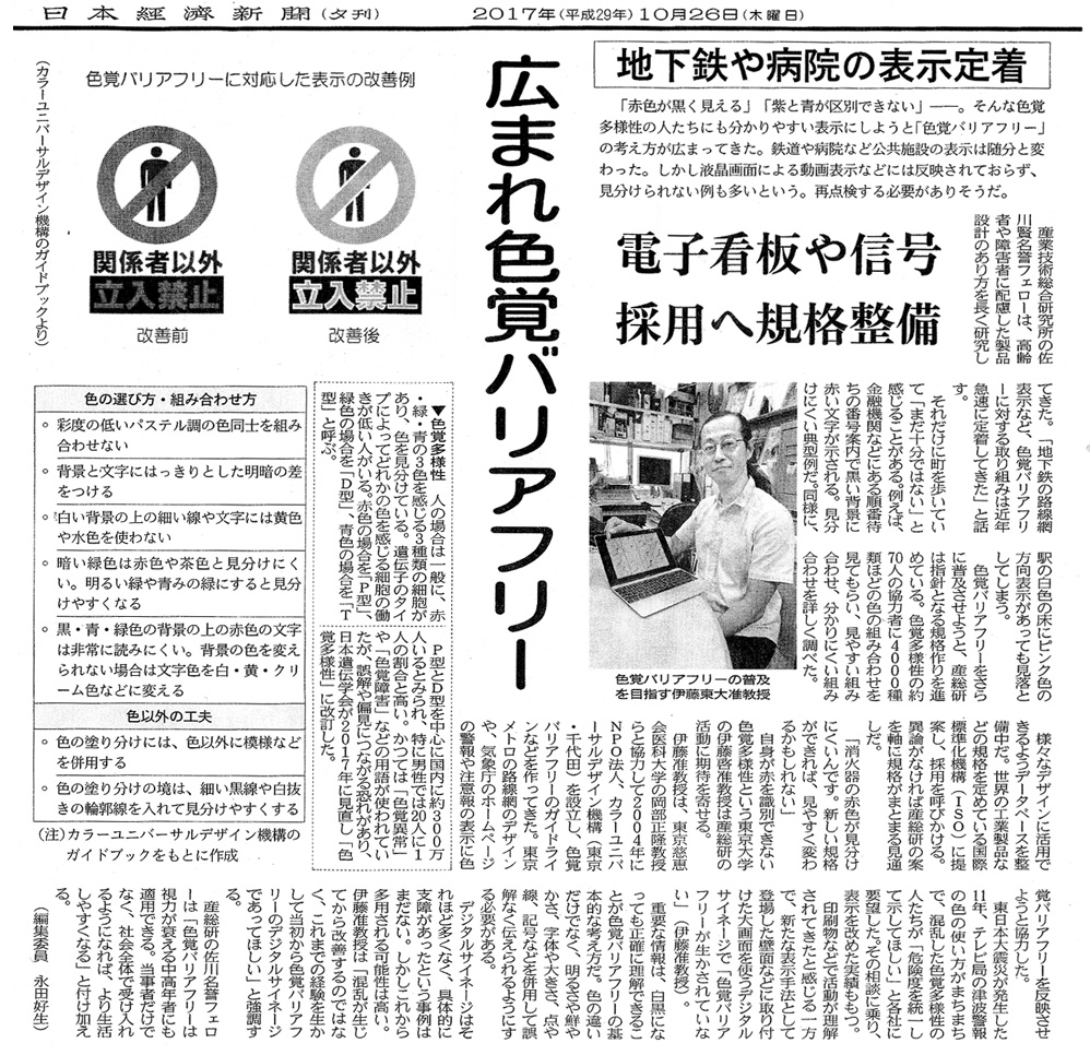 伊藤准教授は、東京慈恵会医科大学の岡部正隆教授らと協力して2004年にNPO法人、カラーユニバーサルデザイン機構(東京・千代田区)を設立し、色覚バリアフリーのガイドラインなどを作ってきた。東京メトロの路線図のデザインや、気象庁のホームページの警報や注意報の表示に色覚バリアフリーを反映させようと協力した。