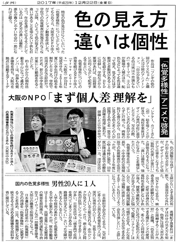 色覚多様性についての啓発を続けるNPO法人「True Colors」(大阪市)が10月に完成させた。2016年夏に小学生向けの絵本を制作したところ、学校で活用されるなど好評だったため、新たに中学生を対象にした動画を作ることにした。