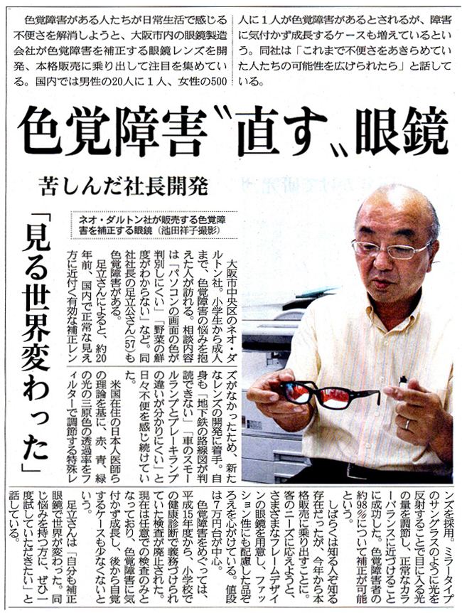 国内で正常な見え方に近付く有効な補正レンズがなかったため、自身も色覚障害がある同社社長、足立公さん(57)が約20年前に開発に乗り出した。「地下鉄の路線図が判読できない」「車のスモールランプとブレーキランプの違いが分かりにくい」と日頃から不便を感じ続けていた。