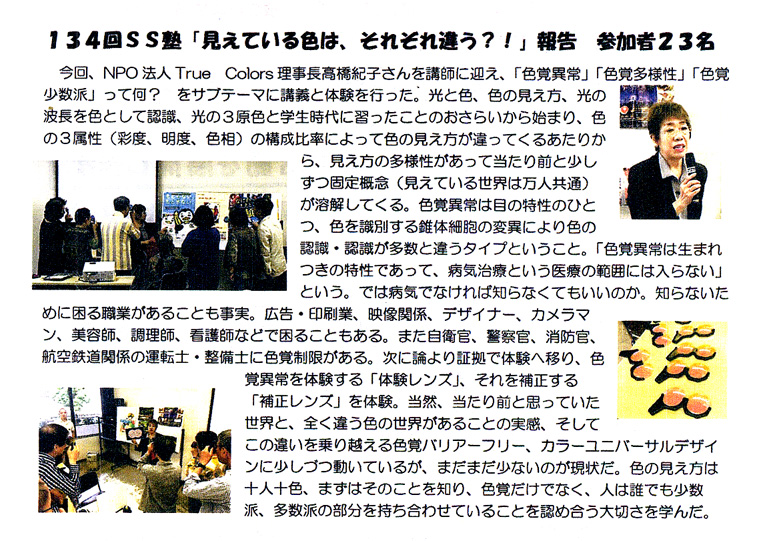 今回、NPO法人 True Colors 理事長高橋紀子さんを講師に迎え、「色覚異常」「色覚多様性」「色覚少数派」って何? をサブテーマに講義と体験を行った。光と色、色の見え方、光の波長を色として認識、光の3原色と学生時代に習ったことのおさらいから始まり、色の3属性(彩度、明度、色相)の構成比率によって色の見え方が違ってくるあたりから、見え方の多様性があって当たり前と少しずつ固定概念(見えている世界は万人共通)が溶解してくる。色覚異常は目の特性のひとつ、色を識別する錐体細胞の変異により色の認識が多数と違うタイプということ。「色覚異常は生まれつきの特性であって、病気治療という医療の範囲には入らない」という。では病気でなければ知らなくてもいいのか。知らないために困る職業があることも事実。広告・印刷業、映像関係、デザイナー、カメラマン、美容師、調理師、看護師などで困ることもある。また自衛官、警察官、消防官、航空鉄道関係の運転士・整備士に色覚制限がある。次に論より証拠で体験へ移り、色覚異常を体験する「体験レンズ」、それを補正する「補正レンズ」を体験。当然、当たり前と思っていた世界と、全く違う色の世界があることの実感、そしてこの違いを乗り越える色覚バリアフリー、カラーユニバーサルデザインに少しずつ動いているが、まだまだ少ないのが現状だ。色の見え方は十人十色、まずはそのことを知り、色覚だけでなく、人は誰でも少数派、多数派の部分を持ち合わせていることを認め合う大切さを学んだ。