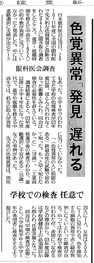 日本眼科医会は19日、2010〜11年度に全国の眼科医で先天的な色覚異常と診断された941人に聞き取り調査をしたところ、進学・就職時期を控えた中高生(185人)の約半数が異常に気づいていなかったと発表した。中には進路選択に支障が出るケースもあった。小学4年で行われてきた学校の色覚検査が03年以降、ほとんど行われなくなった影響と見られ、同会は検査の必要性を訴えている。