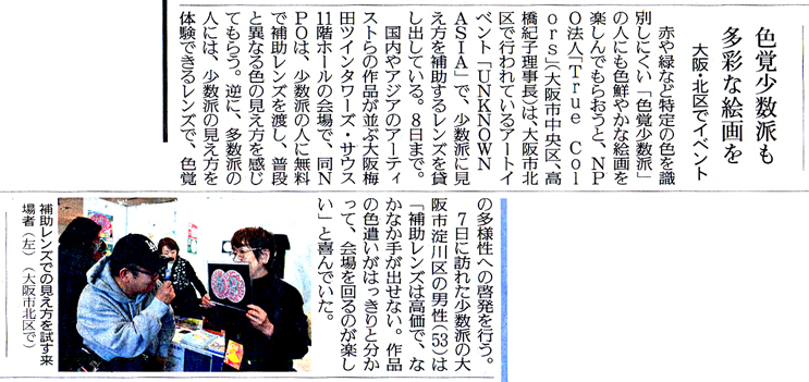 国内やアジアのアーティストらの作品が並ぶ大阪梅田ツインタワーズ・サウス11階ホールの会場で、同NPOは、少数派の人に無料で補助レンズを渡し、普段と異なる色の見え方を感じてもらう。逆に、多数派の人には、少数派の見え方を体験できるレンズで、色覚の多様性への啓発を行う。
